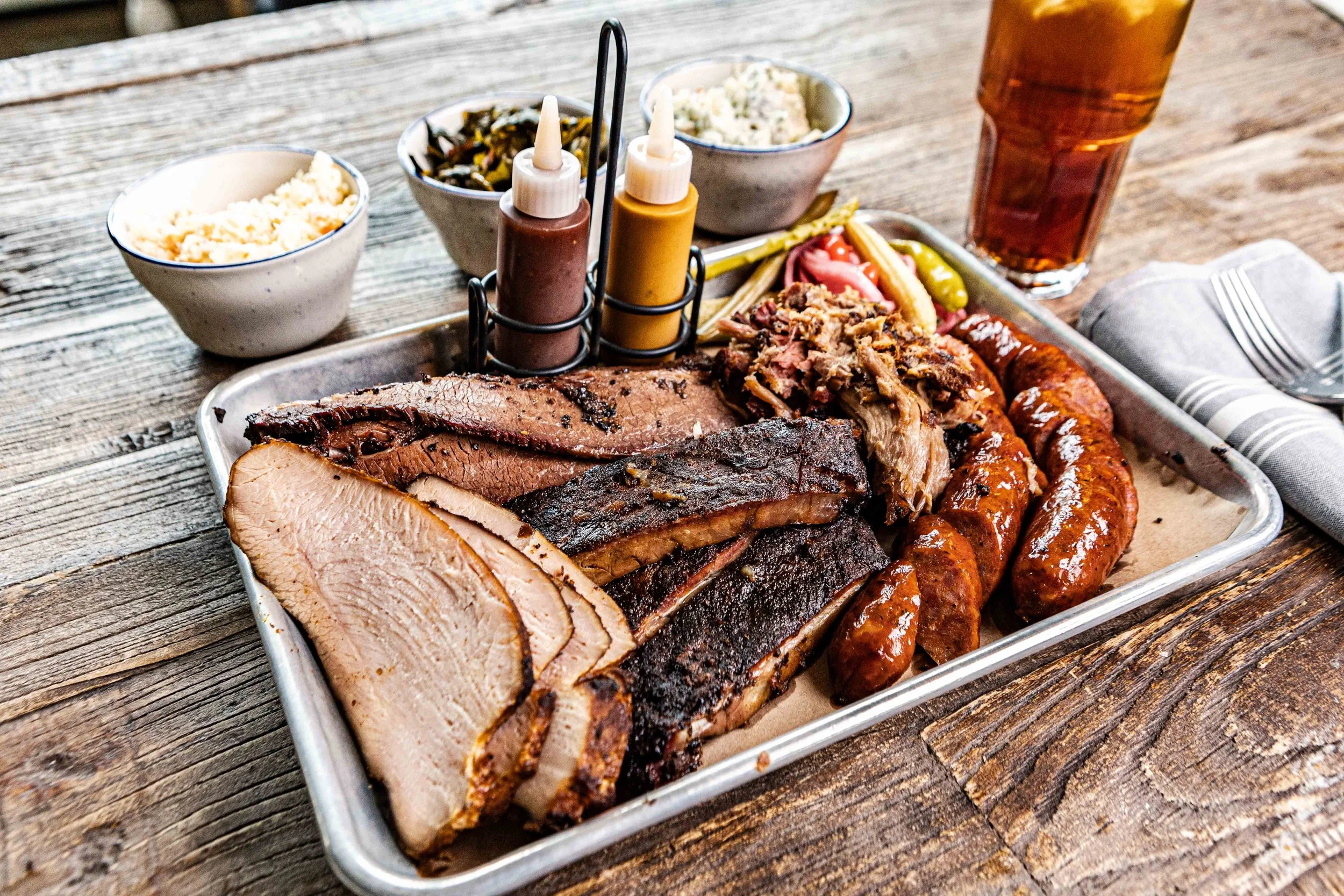 Smoked daily and served while it lasts, our house-smoked barbecue brings bold, comforting flavors to the table. From tender beef brisket and pulled pork to sausage, turkey breast, and St. Louis ribs, each platter is slow-cooked in house and served with classic sides like slaw, pit beans, cornbread, pickles, and BBQ sauce. It is hearty, satisfying, and best enjoyed the old-fashioned way. Come hungry and be sure to check the dining menu for what is smoking today.